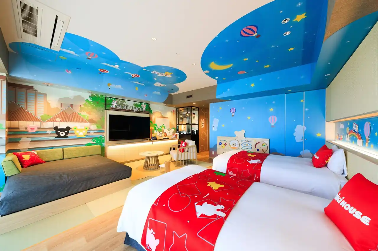 ミキハウスのキャラクター「プッチー」と「うさこ」がお出迎えするお部屋では、大展望露天風呂「棚湯」や庭園「ソラニワ」を楽しむ杉乃井ホテルオリジナルのデザインが広がります。また、バス型のプレイウォールを設け、壁掛けのおもちゃでお部屋内でもお楽しみいただけます。子どものことを第一に考えたものづくりに取り組むミキハウスと、未就学児が安心安全に過ごすことのできる宿泊施設を目指します。1日2室限定のミキハウスルームで、小さなお子さまとの初めて旅行やお祝い旅行にぜひご利用ください。 |
