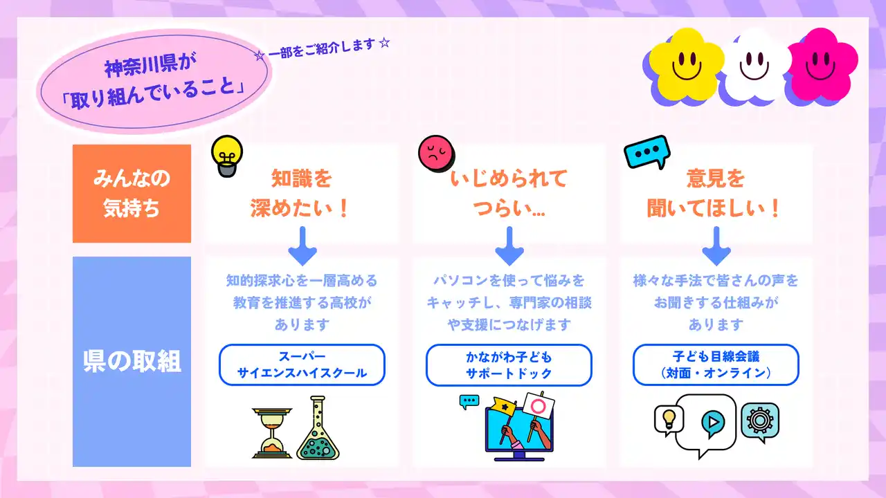 神奈川県では、子どもや若者をはじめ、誰もが「自分らしく幸せに」暮らせる社会の実現を目指し、2025年4月1日に「神奈川県こども目線の施策推進条例」及び「かながわ子ども・若者みらい計画」を施行しました。これらには、子どもや若者が社会の一員として意見を表明する機会を確保するとともに、その意見を施策に適切に反映させることなどが盛り込まれています。 |