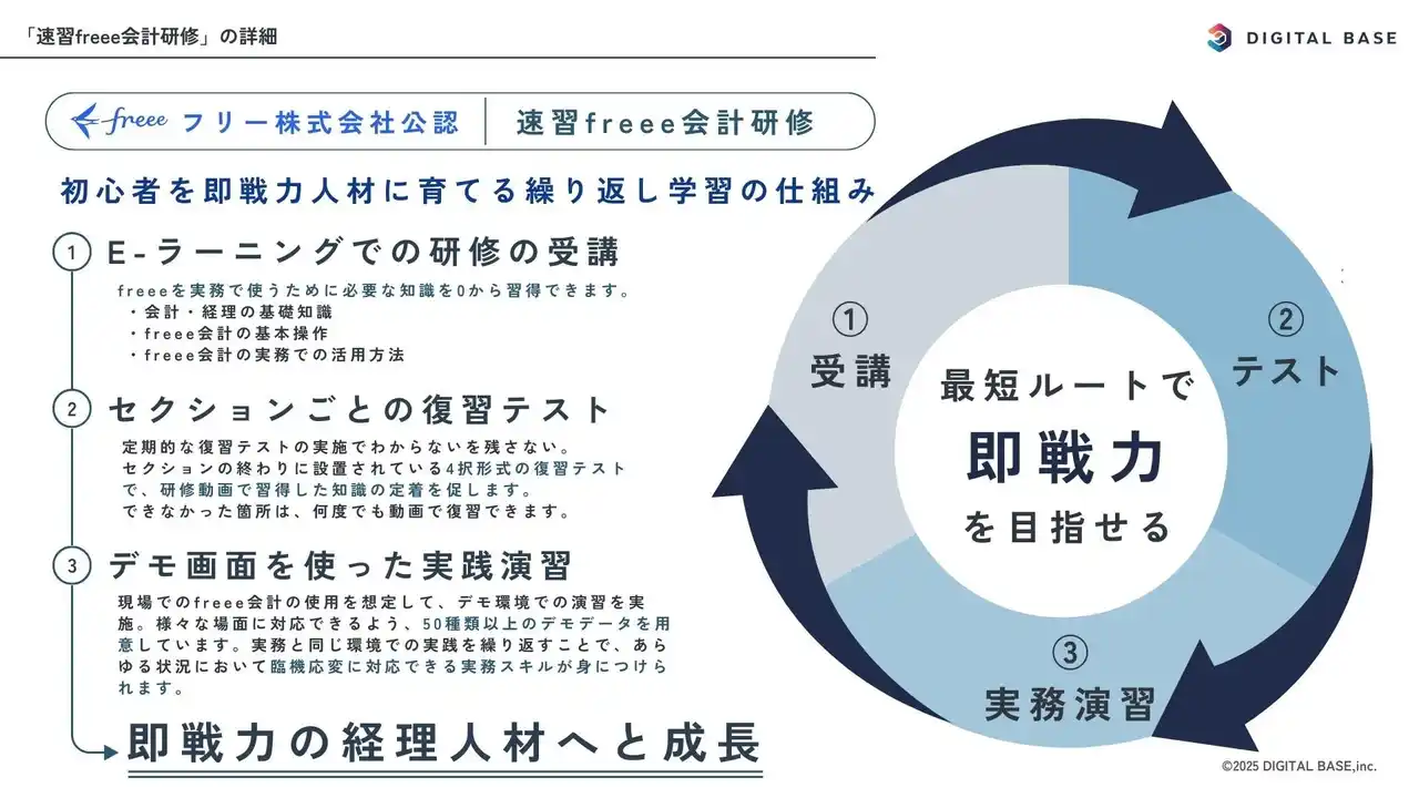 | 「速習freee会計研修」は、公認会計士、税理士、freee認定アドバイザーなどのDIGITAL BASEに在籍する専門家が提供し、freeeが監修するDX会計人材向けの研修です。 | |||