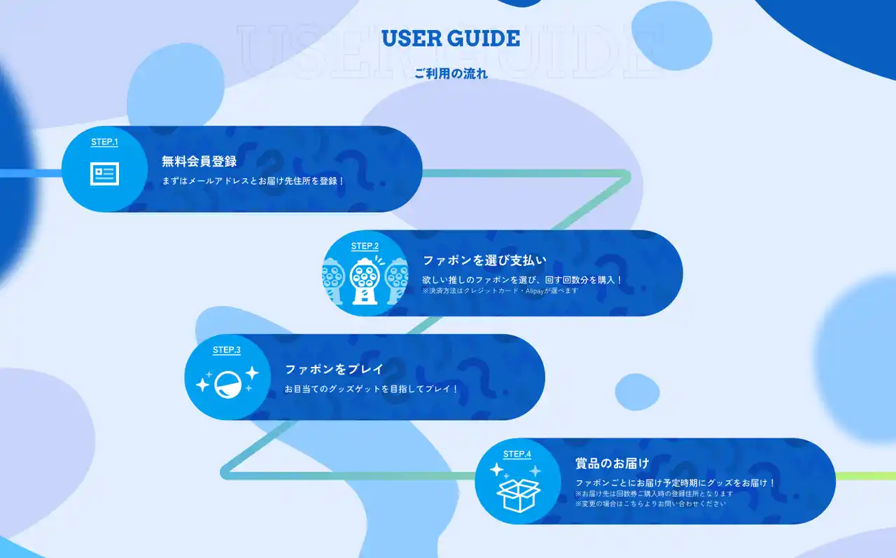 ユーザーの皆様は無料会員登録後に、応援しているインフルエンサー様や人気IPタイトルのFAPON(プレイ台)を選択し、回したい回数分のお支払い後に、FAPONを回してグッズをゲットすることができます。 |