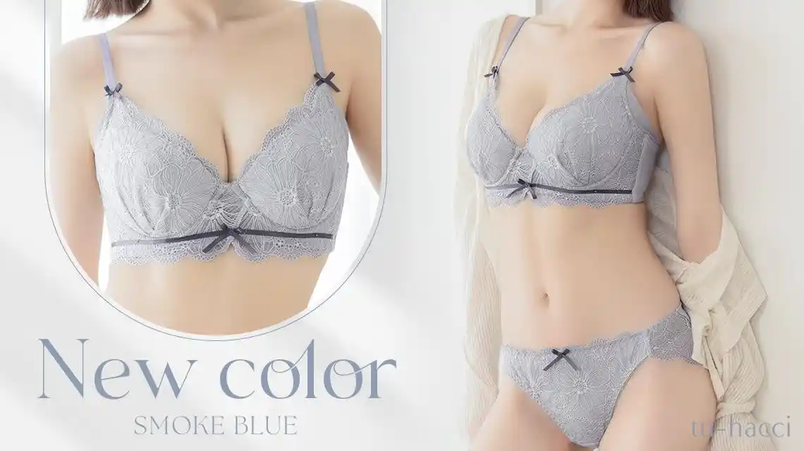 今回、大振りなフラワー柄レースを360°贅沢に使用し、リボンをあしらった女性心をくすぐるデザインの『ダリアレースブラ&ショーツ』より、新色「スモークブルー」が登場いたしました。 |