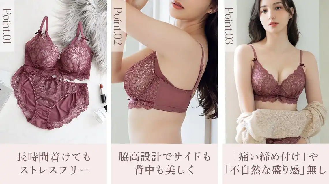 立体三枚ハギ構造で、バストを潰さずふっくらリフトアップ。脇高ブラにありがちな「痛い締め付け」や「不自然な盛り感」が無く、ふんわりとした自然なバストメイクを叶えます。 |