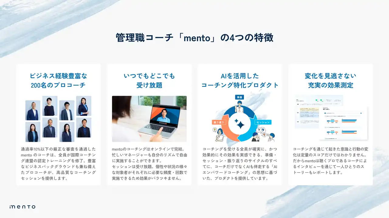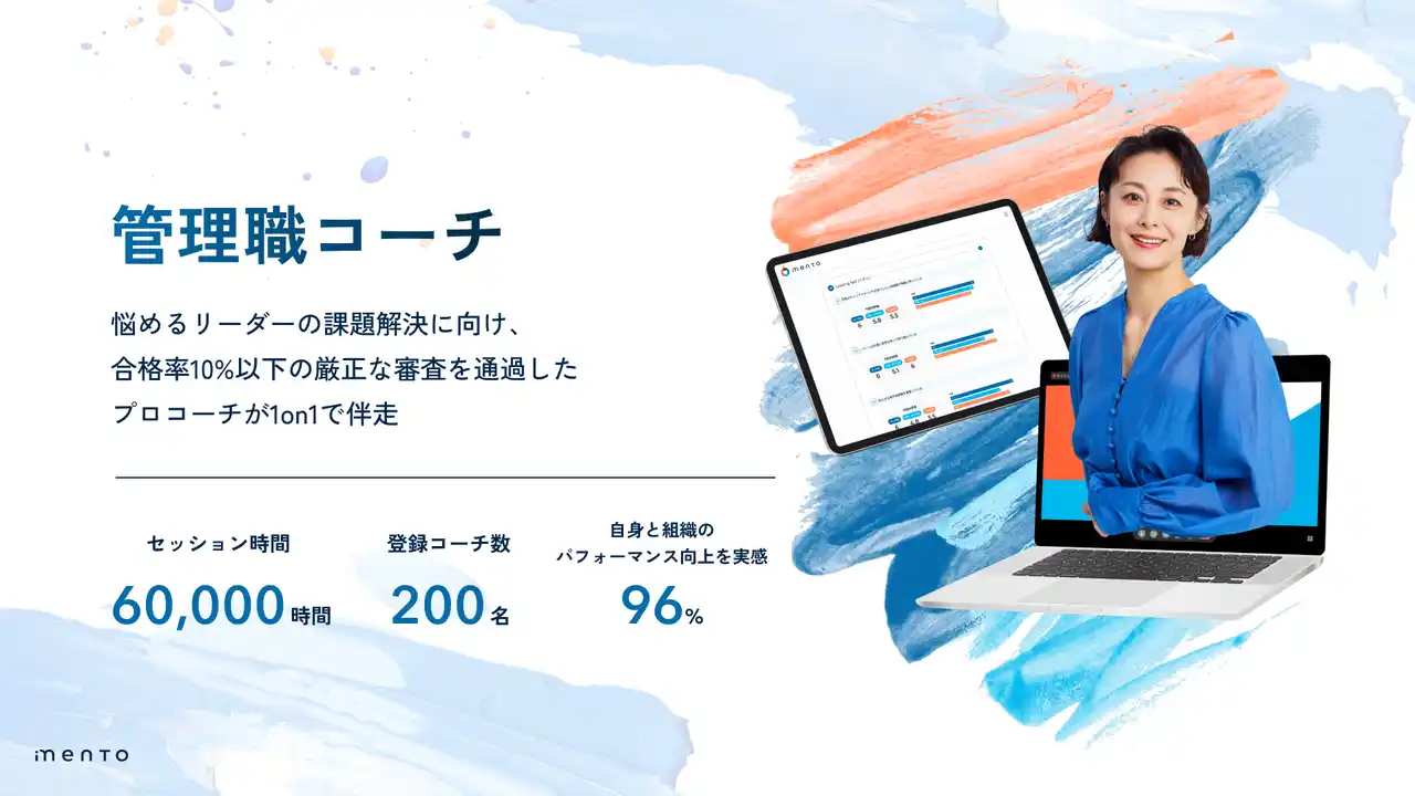 「mento(メント)」は、リーダーの本音を引き出して組織を変える、管理職向けのコーチングサービスです。企業の皆様に高品質なコーチングをより手軽に使っていただけるプラットフォームをオンラインで展開しています。これまでに累計70,000時間以上のコーチングを提供しており、登録コーチは約200名にのぼります。2020年のリリース以降、パナソニック、伊藤忠、電通をはじめとする大手企業を中心に導入が広まっています。 |