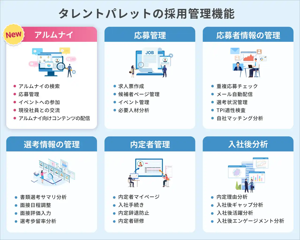 タレントパレットの採用管理システムは、新卒採用、中途採用、アルムナイ採用などの多様な採用活動から入社時の手続きまでを一元管理し、採用に関連する一連の業務の効率化・高度化を支援します。また、人事情報、経歴、スキル、マインド(適性)、社員の希望や想い、日々のモチベーションやエンゲージメントなどの人材データと連携することで人材の最適配置や育成を実現します。 |