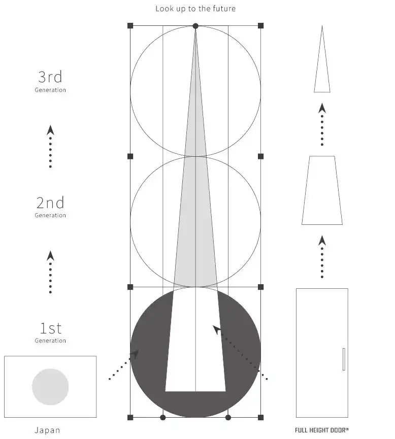 | 社名変更にあたり一新したコーポレートロゴは、今後のグローバル市場への展開を見据え、日本の象徴である日の丸に、見上げた構図のフルハイトドアを重ねたデザインとしました。円を突き抜けるように伸びるドアのシルエットは、一番上の円が表す3世代先の未来に向けて持続的な成長を目指す企業姿勢を表現しています。 | |||