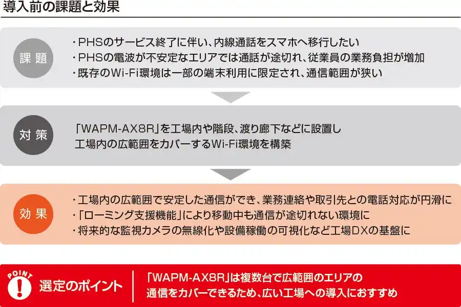 岡山県に本社を構えるオーエム産業は、めっきをはじめとする技術開発や、自動車・電機製品のめっき加工を手がけています。 同社は工場内の内線通話にPHSを使用していましたが、一部エリアでの電波不安定による通話切断や、折り返し対応の手間が負担となっていました。加えて、将来的なPHSサービス終了も見据え、内線通話のスマホ移行を決定。約60台のスマホと既存の端末を含めた約150台が安定して通信できるよう、Wi-Fi 6(11ax)対応の「WAPM-AX8R」などでWi-Fi環境を強化。「ローミング支援機能」を有効化し、移動中も通信が途切れることのない環境を構築しました。 |