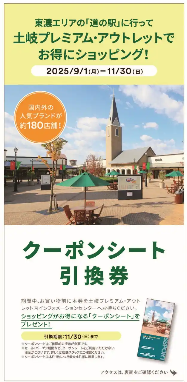 対象の道の駅に設置されたクーポンシート引換券を、土岐プレミアム・アウトレットのインフォメーションセンターへお持ちいただくと、アウトレットの対象店舗で割引や特典を受けられるクーポンシートをプレゼントします。 |