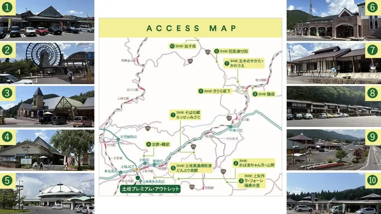 土岐プレミアム・アウトレットでは、これまでにも岐阜県の伝統工芸や豊かな食をPRするイベントを開催し、地域の発展と活性化にも積極的に取り組んでいます。全国第2位の道の駅数※を誇る岐阜県は55駅もの多くの道の駅があり、土岐プレミアム・アウトレット周辺の東濃エリアには個性豊かな10駅が点在します。ドライブでの旅行の楽しみが広がる道の駅とのタイアップにより、土岐プレミアム・アウトレットと、土岐市、恵那市、中津川市に所在する10か所の道の駅をつなぎ、「面」で地域の魅力を発信します。 |