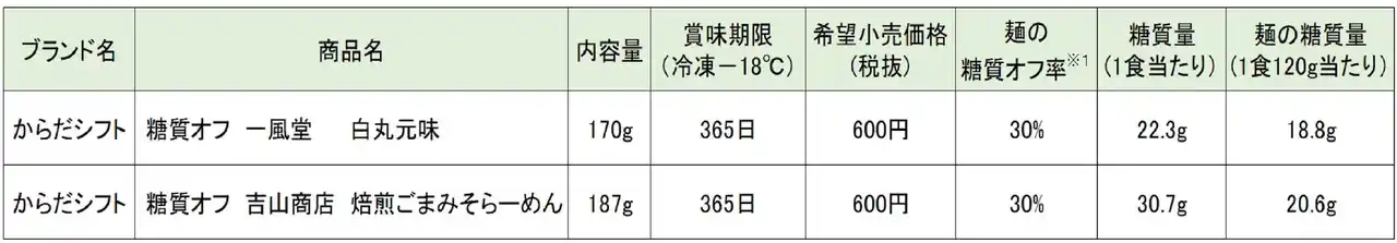 三菱食品株式会社(東京都文京区)は、9月1日(月)より健康ブランド「からだシフト」冷凍食品「糖質オフ 一風堂 白丸元味」と「糖質オフ 吉山商店 焙煎ごまみそらーめん」をスーパーマーケット、生協、ドラッグストアをはじめとした全国で順次発売します。 |
