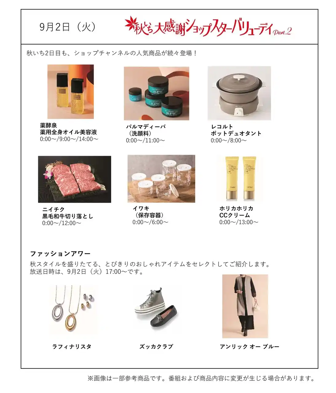 24時間365日双方向型ライブ放送のショッピング専門チャンネル「ショップチャンネル」を運営するジュピターショップチャンネル株式会社(代表取締役社長:小川吉宏、所在地:東京都江東区、以下 「ショップチャンネル」)は、9月1日(月)、2日(火)の2日間、「秋いち大感謝ショップスター |
