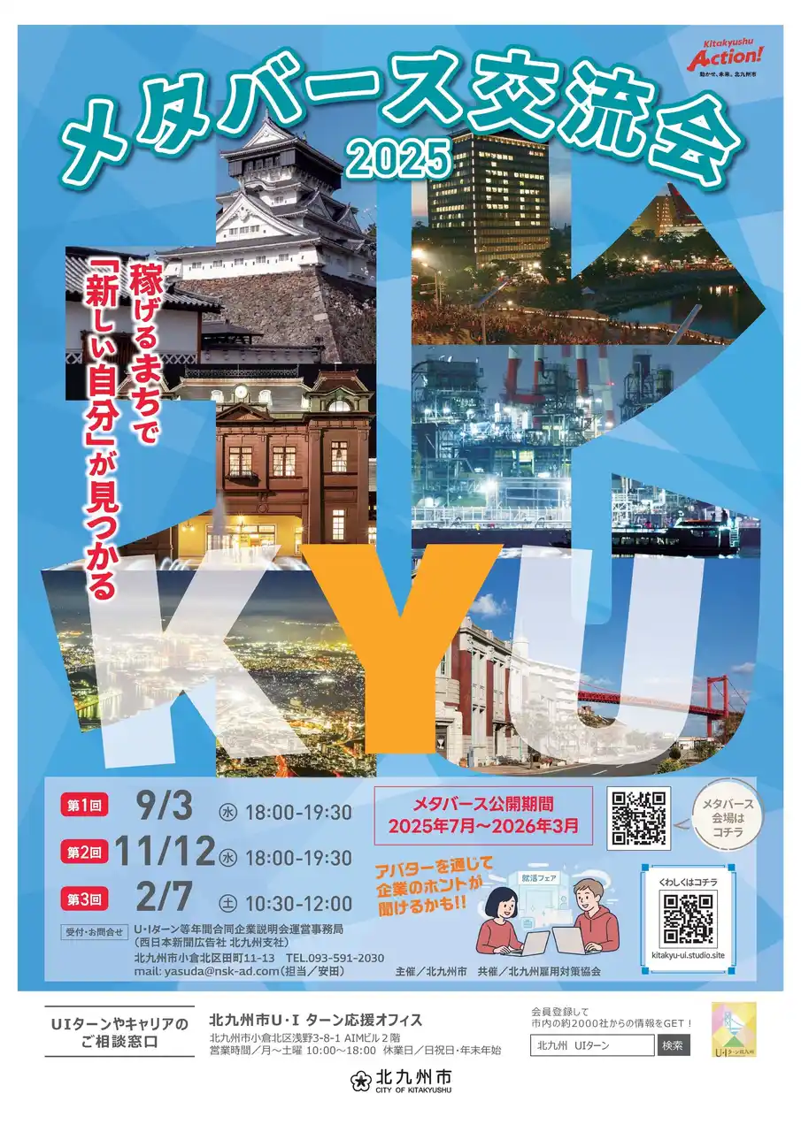 北九州市では、最新のメタバース技術を活用した新しい就職イベント「メタバース交流会」を開催いたします。 |