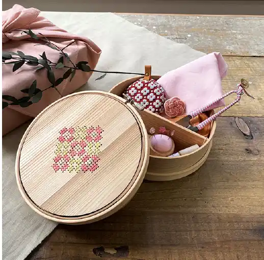 蓋にクロスステッチを施した、曲げわっぱの道具箱。お裁縫に必要な道具が一式入った、大人の上質な裁縫道具セット。 |