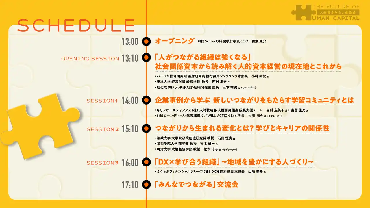 インターネットでの学びや教育を起点とした社会変革を行う株式会社Schoo(本社:東京都渋谷区、代表取締役社長CEO:森健志郎、以下「スクー」)は、9月3日(水)に、「人的資本みらい勉強会」を開催します。 |