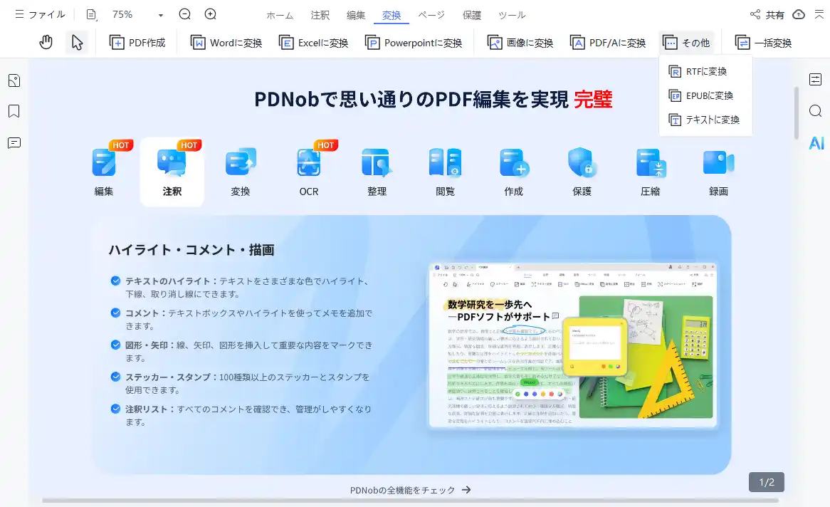 | 市場には多くのPDF編集ソフトが存在しますが、「PDNob」の最大のメリットは「機能の豊富さ」と「軽快な動作」の両立にあります。 | |||