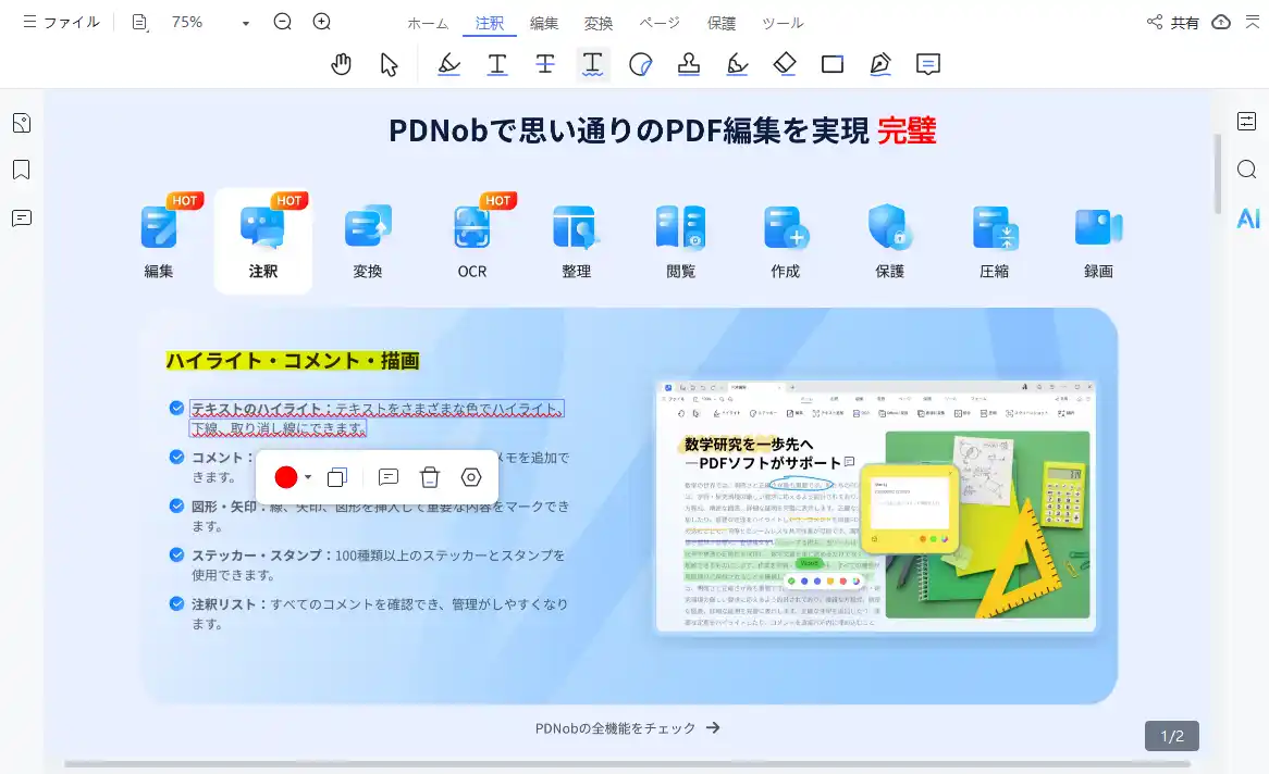 初心者からビジネス利用まで幅広く対応可能 直感的なUIはPDF編集が初めての方でも安心。一方で、電子署名や高度な注釈、AI機能はビジネスの第一線でも十分に活躍します。 |