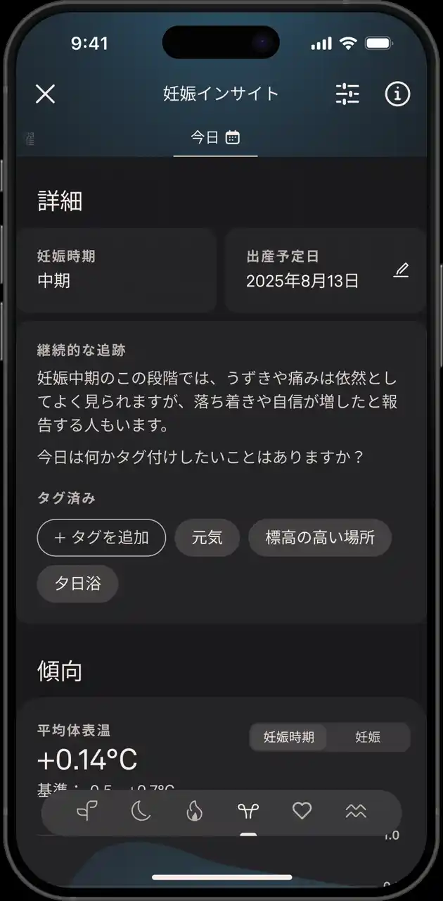 ・「症状記録」タグシステム:症状や感情を簡単に記録でき、週ごとに科学文献に基づく一般的な症状メッセージを表示 |