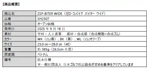 ブリヂストンスポーツ株式会社は、“幅広甲高でもスポーティなスパイクレスシューズを履きたい”というゴルファーのニーズに応えた、幅広甲高設計で高いグリップ力を追求したスパイクレスシューズ『ゼロ・スパイク バイター ワイド』(SH2507)を、9月18日に発売します。価格はオープンです。 |