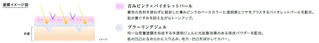 ブラーリングジェルが肌に寄り添うようになめらかに密着、肌表面をつるんと均一に整えます。 |
