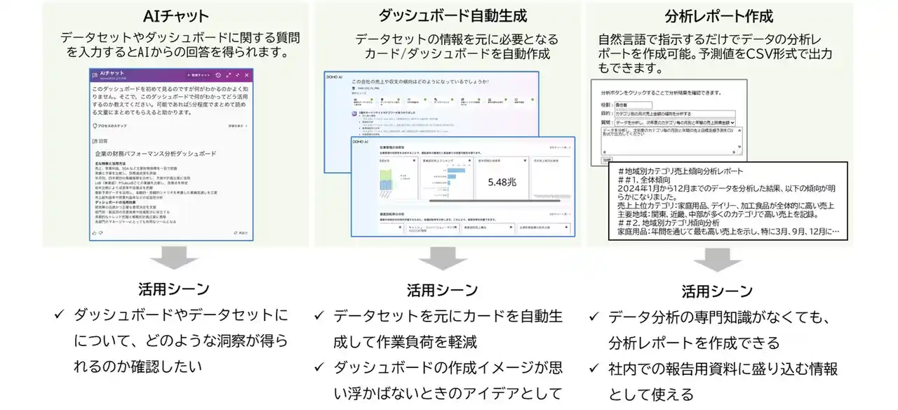 AIチャットやダッシュボードの自動生成などにより、専門知識がなくても必要な情報を簡単に引き出せます。これにより、担当者のスキルに関わらず、全社でデータ活用が進めやすくなります。また、ボタン一つでデータから読み取れる情報をテキスト化する機能も備わっているため、効率的に報告用資料の作成が可能となります。 |