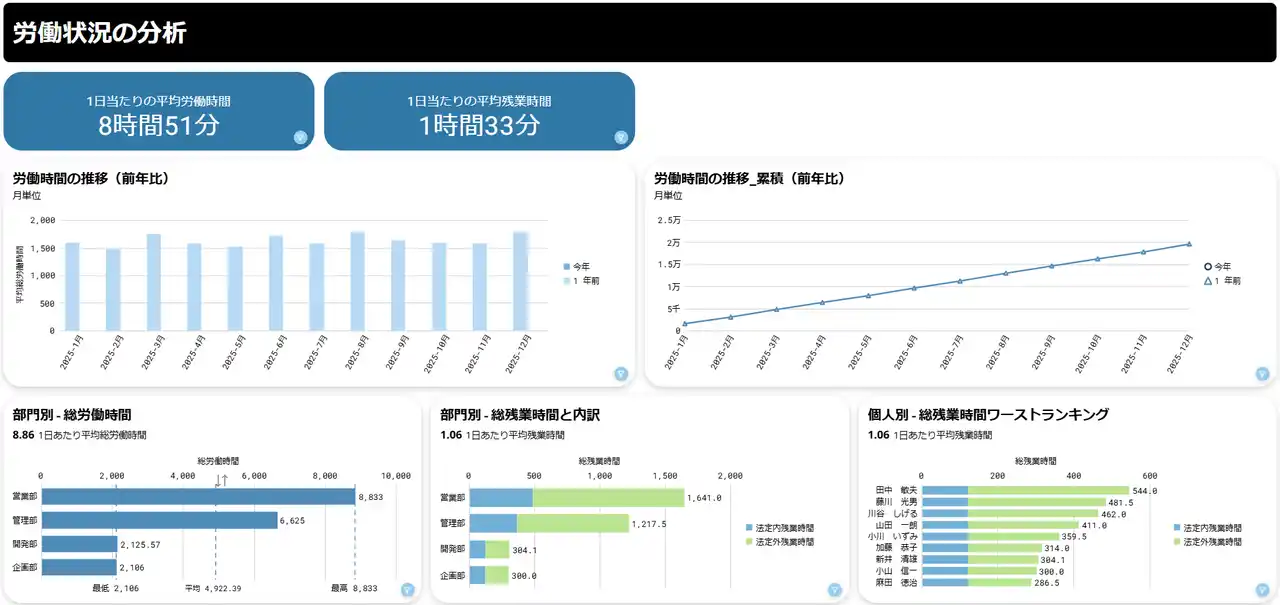 2.HR編 「労働時間」「年次有給取得状況」など17種のカードで構成。労務コンプライアンス、ワークライフバランス指標、人材の流動性、多様性など、社員の働き方と組織構造を網羅的に“見える化”できます。その結果、人事・総務部門における法令遵守リスクの早期発見や採用・定着施策、従業員の健康管理、ワークライフバランス改善に向けた戦略立案のPDCAをスピーディに回せます。 |