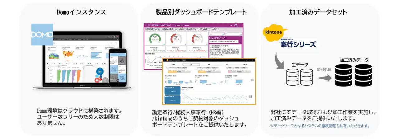 このたび両社の協業による新たな取り組みとして、中堅・中小企業が現実的なコストでDomoを活用できる仕組みであるソリューションパッケージプランを実現しました。 |