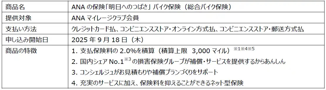 ・2025年9月18日より、マイルが貯まるANAの保険「明日へのつばさ」にて、新たにバイク保険 を発売いたします。 |