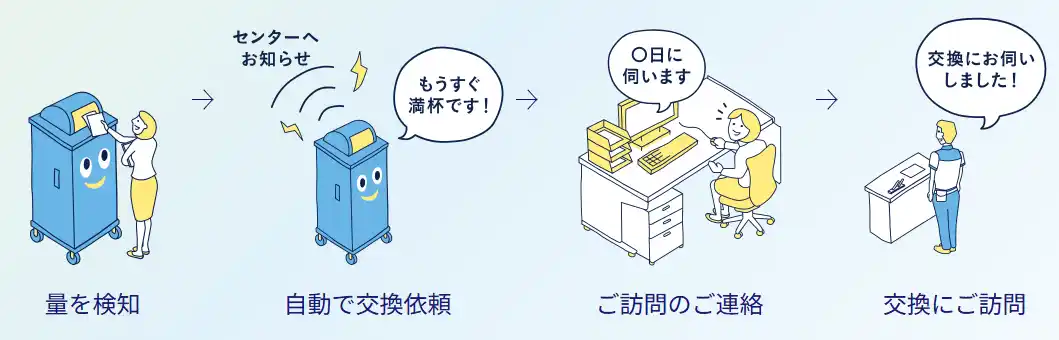 | 「Smart保護くん」は、回収ボックス内の文書量を自動で検知し、回収が必要なタイミングで自動的に依頼を行う仕組み(ビジネスモデル特許:特開2017-210346)を採用しています。これにより、総務部は機密処理依頼の自動化により手間を削減。シュレッダー作業にかけていた時間を本来の業務に充てられるようになるため、生産性の向上にも大きく貢献します。 | ||||||||||||