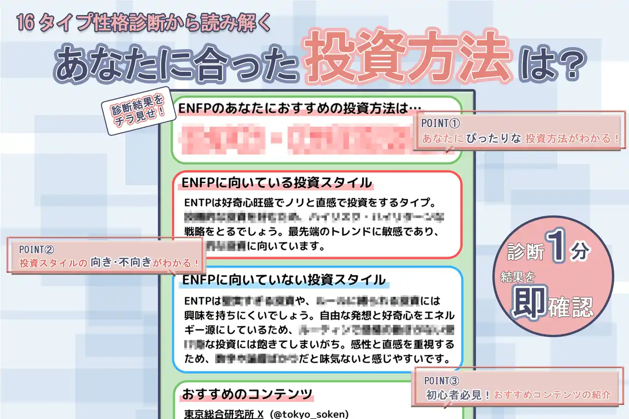 株式会社東京総合研究所(本社:東京都渋谷区、代表取締役:大山充)は、企業の採用現場でも使われる「16タイプ性格診断」を投資分野に応用した新サービス「16タイプ別投資スタイル診断」を2025年8月20日より提供開始しました。 |