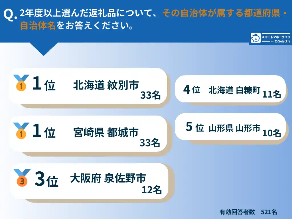 ここからは「どの自治体のどのような返礼品がリピートされているのか」を紹介します。有効回答521名(自治体名の回答が正確だった回答者)が挙げた自治体名のランキング結果は下記のとおりです。 |
