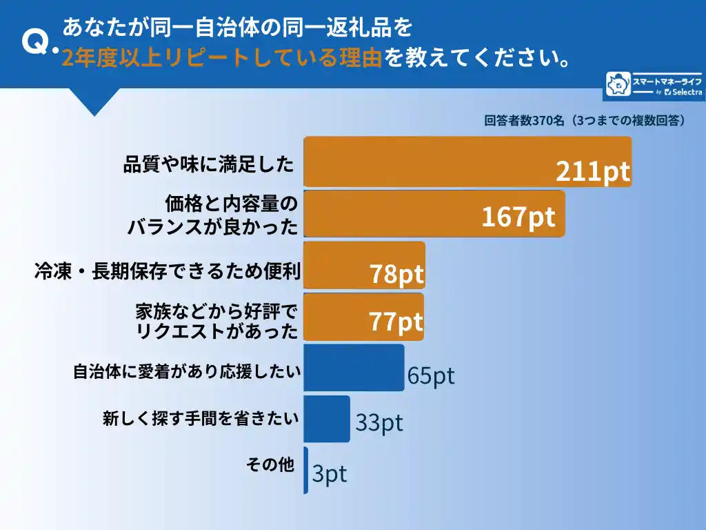 セレクトラ・ジャパン株式会社(東京都渋谷区、代表取締役:グザビエ・ピノン)が運営する、お金の情報メディア「スマートマネーライフ(https://smart-moneylife.jp)」では全国在住の20歳以上の男女3,000名へふるさと納税の利用について調査。その内、同一自治体・同一返礼品への寄付を2年度以上繰り返している計370名を対象に独自アンケートを実施しました。 |