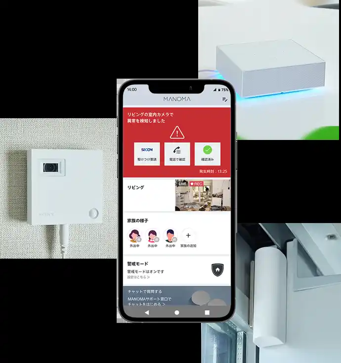 MANOMAは、「セキュリティ」「見守り」「オートメーション」に家事代行などの「家ナカサービス」を加えた、ライフスタイルに新たな体験価値を提供するスマートホームサービスです。ソニーのIoT機器とスマートフォンを組み合わせることで、お家の便利・安心・快適をサポートします。 |