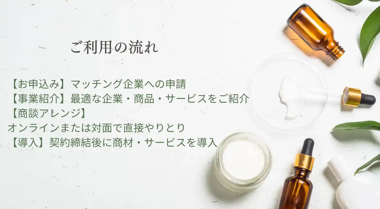 | 【お申込み】マッチング企業への申請【事業紹介】最適な企業・商品・サービスをご紹介【商談アレンジ】オンラインまたは対面で直接やりとり【導入】契約締結後に商材・サービスを導入 | |||||||||