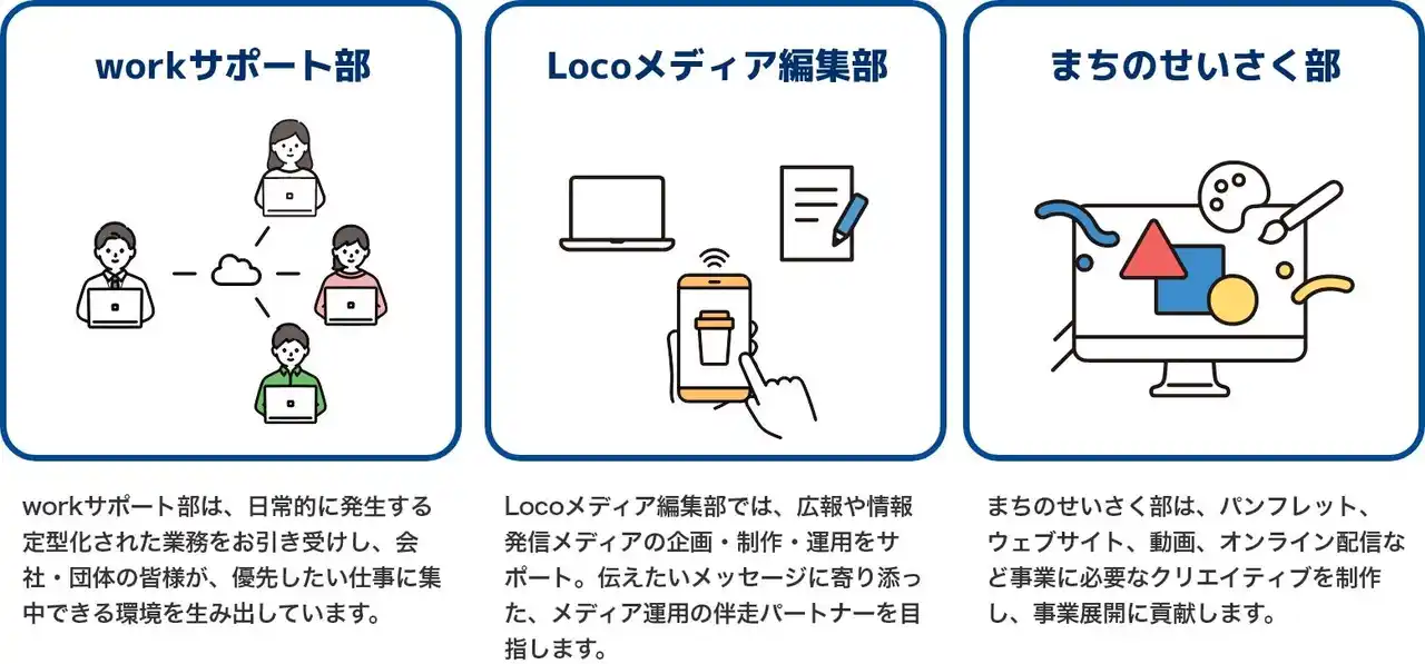 バックオフィス、事務局、広報など多くの組織でリソース不足になりがちな分野の「困った」に寄り添い、2012年の創業時から実績を積み重ねて進化してきたワークシェアチームの仕組みで解決していきます。対応するのは「workサポート部」「Locoメディア編集部」「まちのせいさく部」の3部門。経理や総務などのルーティン業務のアウトソースから、なんでも屋人材の異動・退職等による業務整理が必要な部門の再構築~運用、テンプレート型プロジェクトの複数運用、紙媒体・Web・動画・SNSも含めた広報の企画~運用など、各社・各団体の「困った」に寄り添い、オーダーメードでサポートしていきます。 |