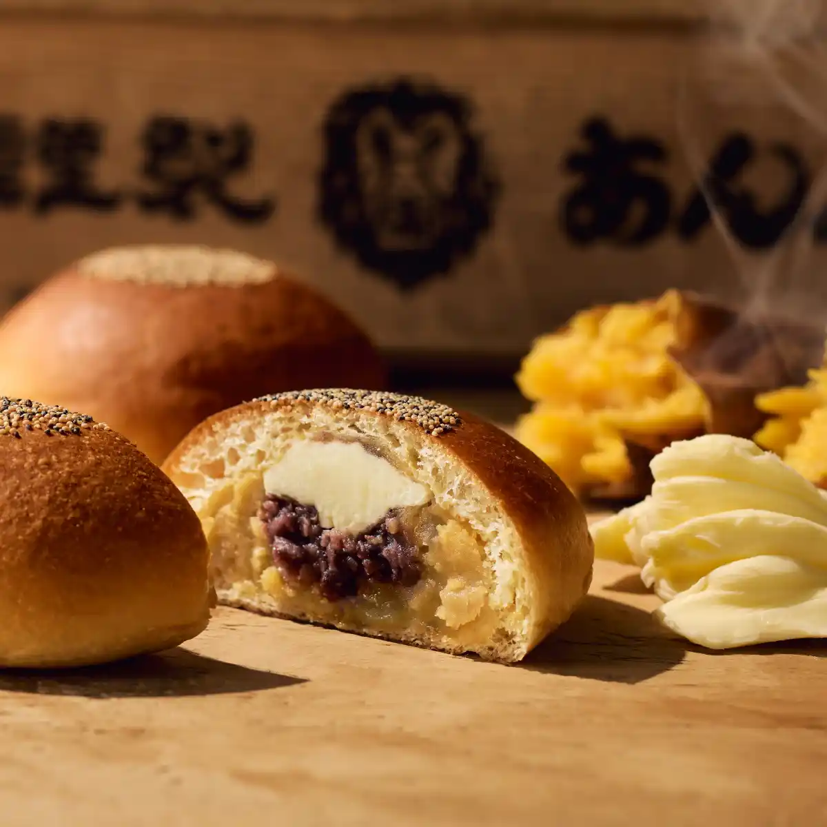 岡田謹製『あんバタパン』が『薩摩芋』とタッグを組んだ。主将『安納芋』の薩摩芋軍団で気分は秋晴れな『餡子』に鍛えあげ、バタークリームとかじってみれば、百戦錬磨の味がする。 |