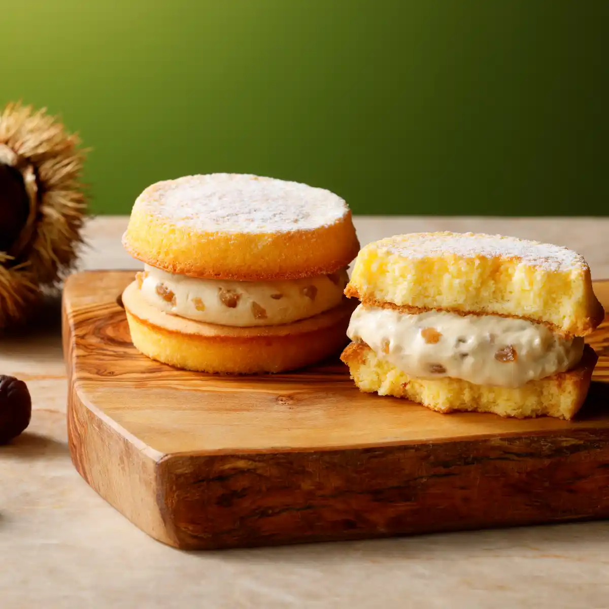 北海道生乳100%使用のマスカルポーネを使用したコクのあるなめらかなクリームにマロングラッセを加え、クリームチーズを練り込んだしっとり生地でサンドしました。 |