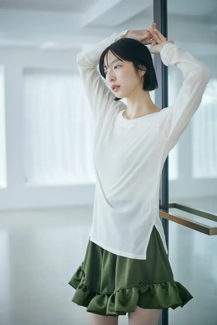 『OPEN BACK SHEER LOUNGE TOP』とのレイヤードで、素肌の美しさが引き立つ、気品を感じるスタイルに。 |