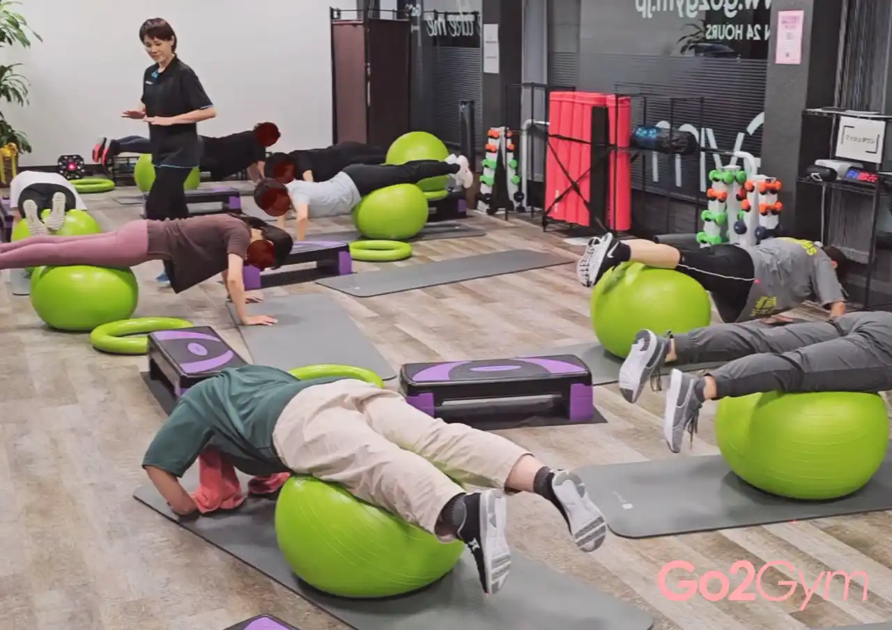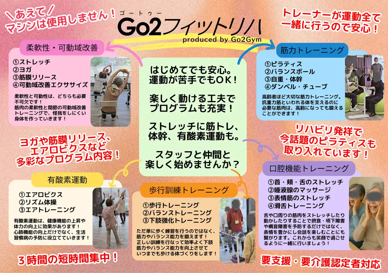Go2Gymの大きな特徴は、同じ場所で、介護保険適用の地域密着型通所介護「Go2フィットリハ」も運営している点です。 こちらもあえてマシンを置かず、専門スタッフが毎回フォームを直接指導します。 フィットネス型デイサービスとしても先進的なピラティス、バランスボール、筋力・体幹トレーニング、歩行訓練など多彩なプログラムを通じて、介護予防から体力向上まで幅広くサポートします。 |
