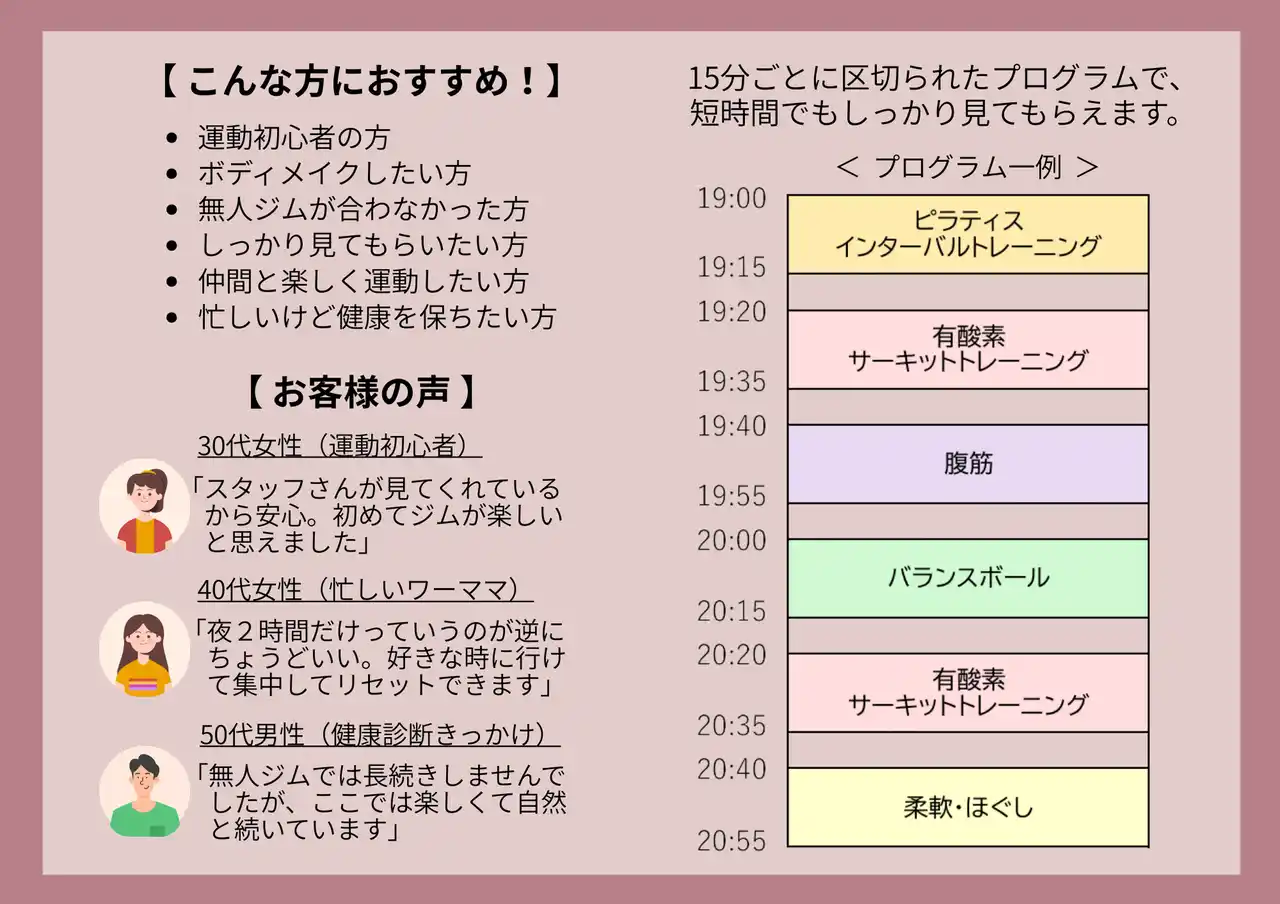 今回の値下げは、営業時間を平日夜19時~21時の2時間に特化し運営効率を高めることで実現しました。これにより、より多くの方が高品質な運動指導を手軽に受けられるようになります。 |