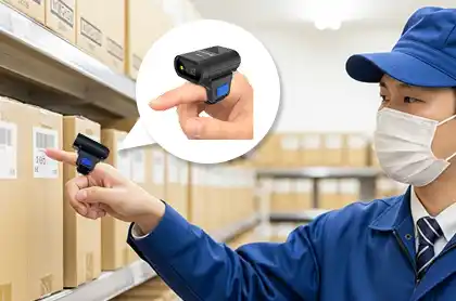 人差し指に装着してハンズフリーで作業できる、Bluetooth対応のリングスキャナ。軽量・コンパクトで、導入しやすい低価格と高速読み取りを実現。 |