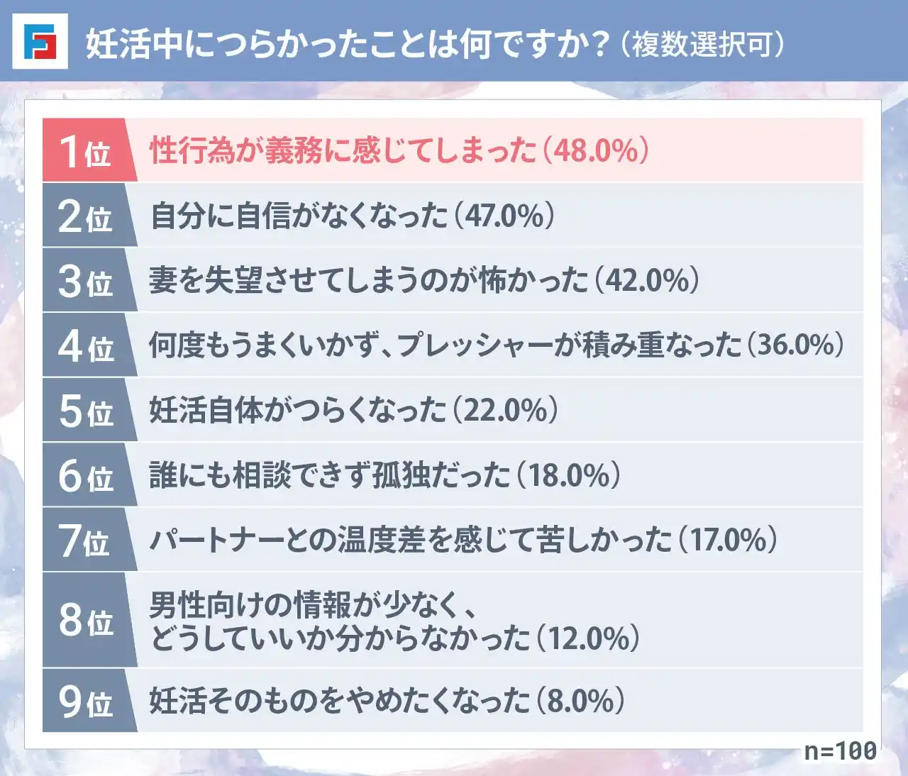 一方で、妻の排卵日を意識した行動で「強いプレッシャーを感じた」「身体が反応しなくなり、自分でも驚いた」といった葛藤も見られました。 |