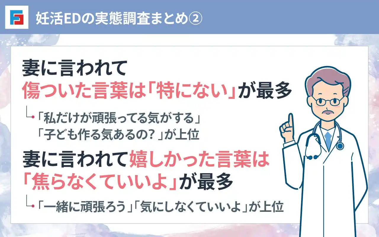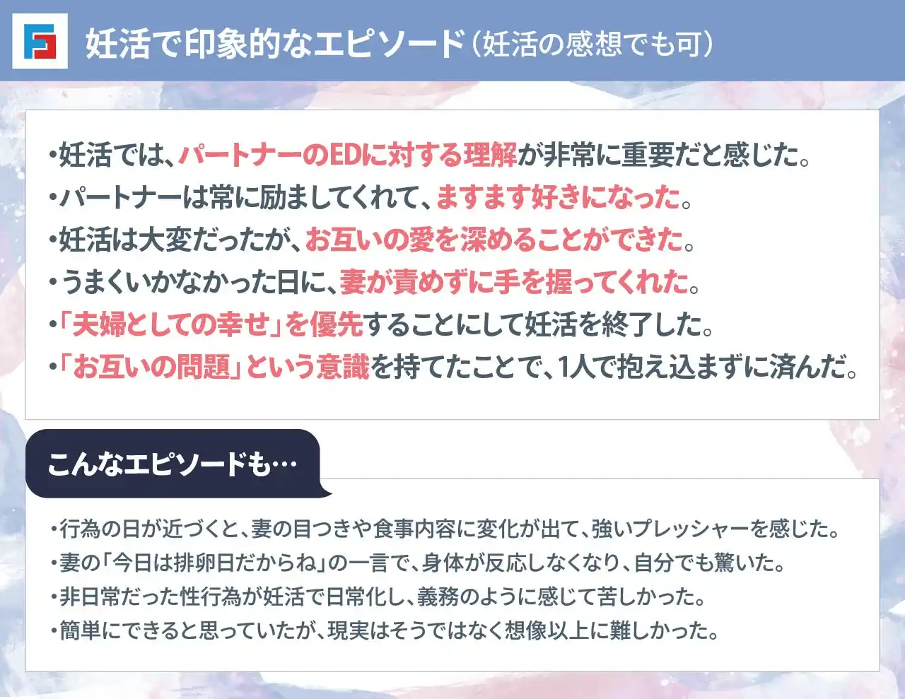 「EDに対する理解が非常に重要だと感じた」「責めずに手を握ってくれた」といったエピソードからは、妻の相手を思いやる言葉や行動が、夫の支えになっていたことがうかがえます。 |