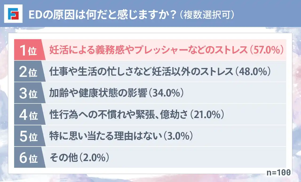 EDの原因として最も多く挙げられたのは、「妊活による義務感やプレッシャーなどのストレス」でした。 |