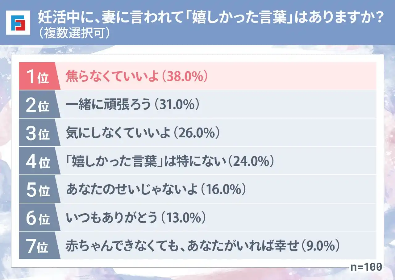 妊活中に妻からかけられて嬉しかった言葉として、最も多かったのは「焦らなくていいよ」でした。 |