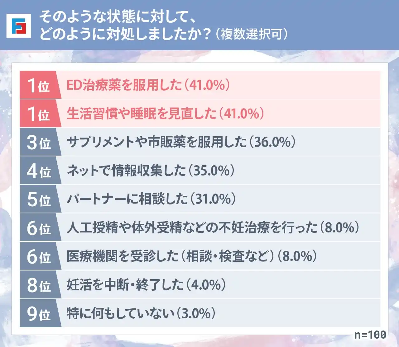 ED症状への対処としては、「ED治療薬を服用した」と「生活習慣や睡眠を見直した」が同率で最多となりました。 |