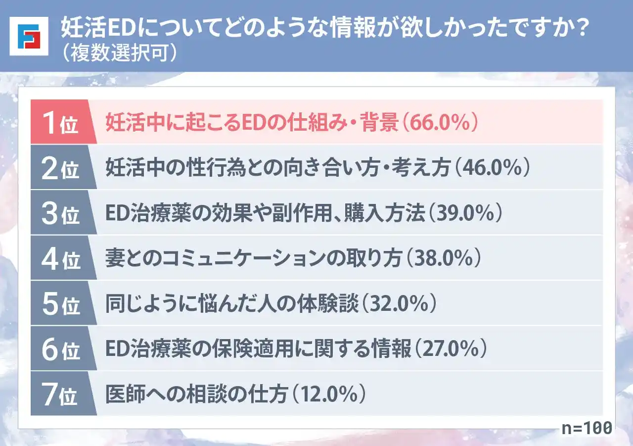 妊活中に欲しかった情報としては、「妊活中に起こるEDの仕組み・背景」が最多でした。 |
