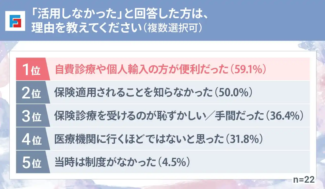 保険を活用しなかった理由としては「自費診療や個人輸入の方が便利だった」が最多となりました。そのほか「保険適用されることを知らなかった」「保険診療を受けるのが恥ずかしい/手間だった」が挙がり、制度の認知不足や心理的ハードルが浮き彫りになりました。 |