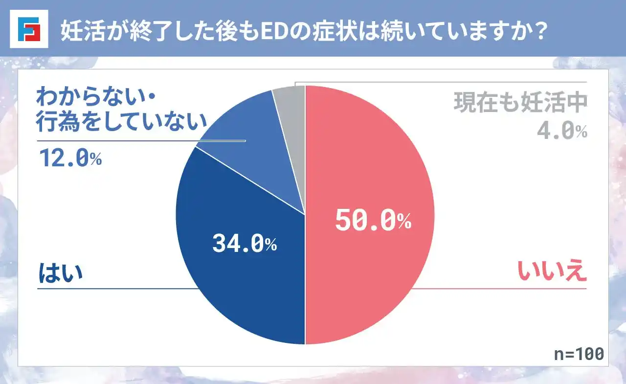 妊活終了後もEDの症状が続いているかの問いに対し「はい」と回答した人は3割以上にのぼり、一時的な症状にとどまらない可能性も示唆されました。 |