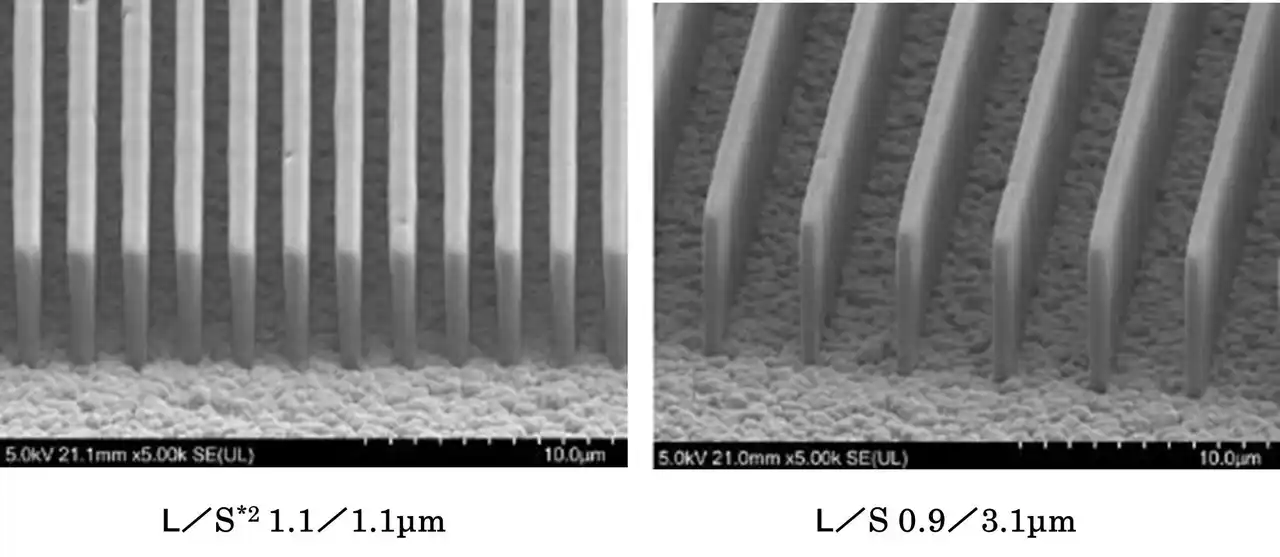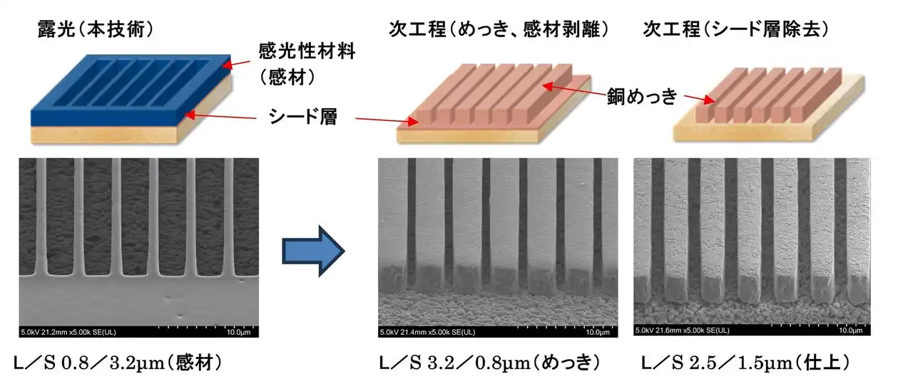 | (感光性材料への回路パターン焼き付けおよび現像後走査型電子顕微鏡写真) | |||