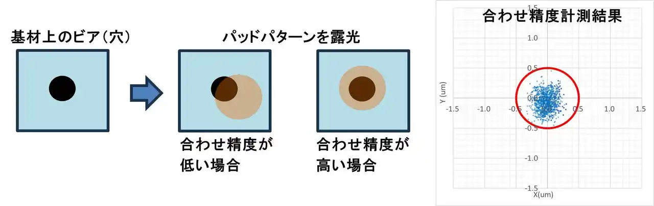 | ダイレクト露光装置は、フォトマスクの設計や製造にかかる時間とコストを削減し、先端パッケージの開発期間の短縮や量産時のプロセス効率化を可能とする特徴があります。しかし、先端パッケージの製造に適用するには、配線を微細化するための解像性や、正確な位置に露光するための位置合わせ精度の向上が必要でした。 | |||