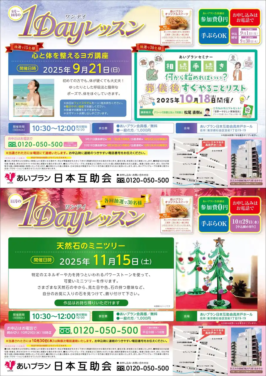 心と体をほぐすヨガ講座や悩みの多い相続手続きについてのセミナー、クリスマス前には天然石のミニツリー作り講座が開催されるなど、高井戸ホールでも引き続きイベントが盛り沢山です。 |